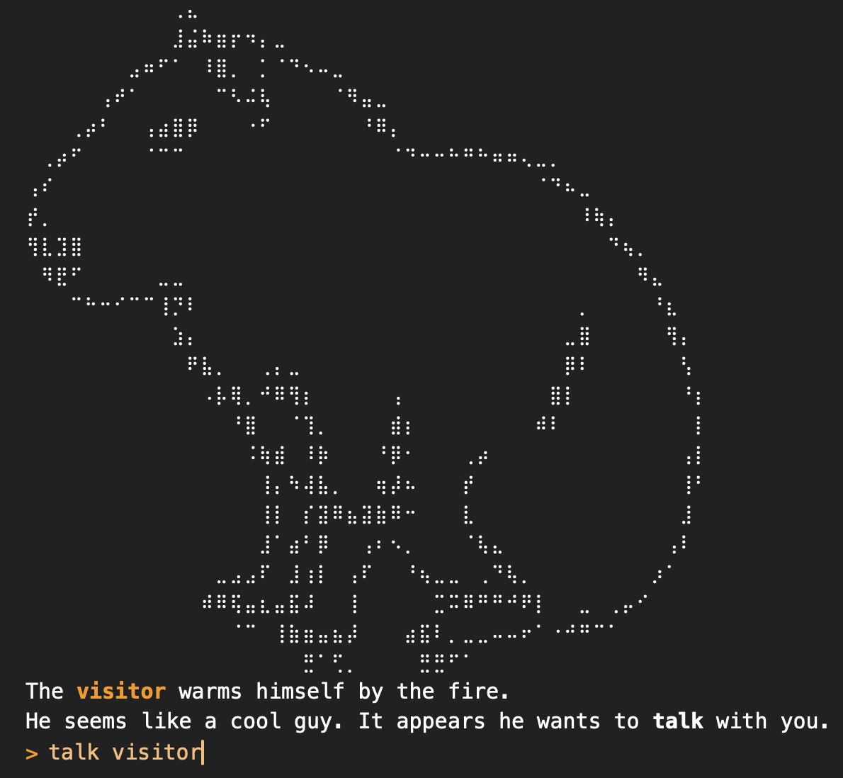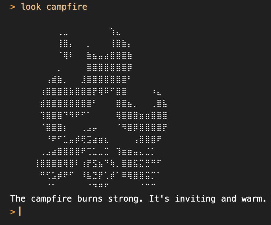 Text adventures, by nature, are super constrained. It was a ton of fun finding ways to describe the scene in a restricted interface—in the end, ASCII art ruled supreme. The player can "look" at any interactive object and see a handsome, text-based image.
