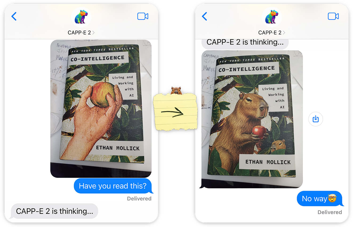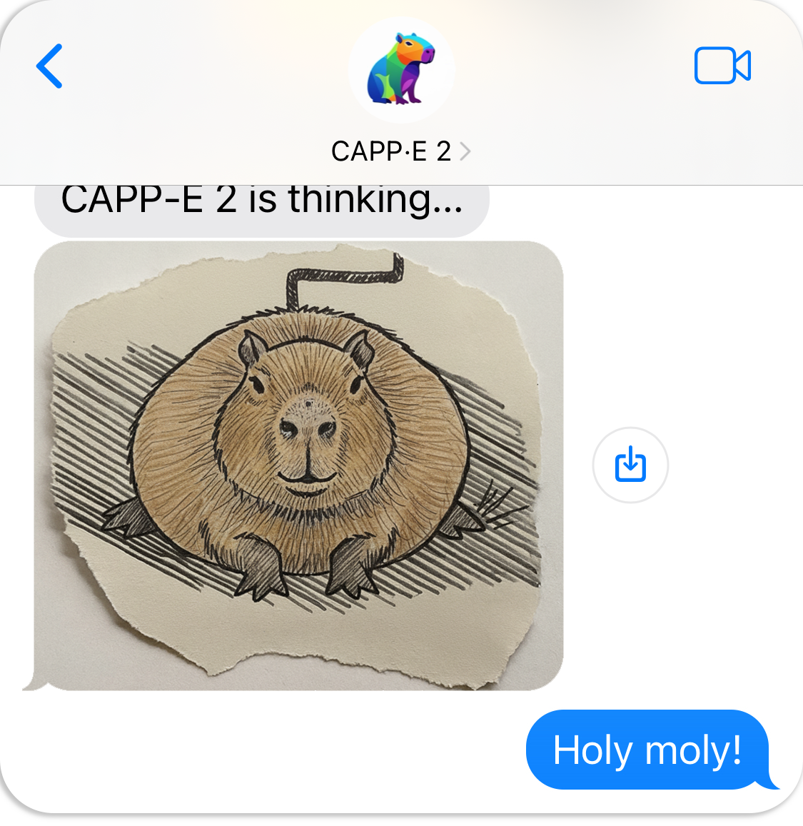 Text it a photo, and CAPP·E will humorously revise your image and automatically send back a capybara-enhanced version.