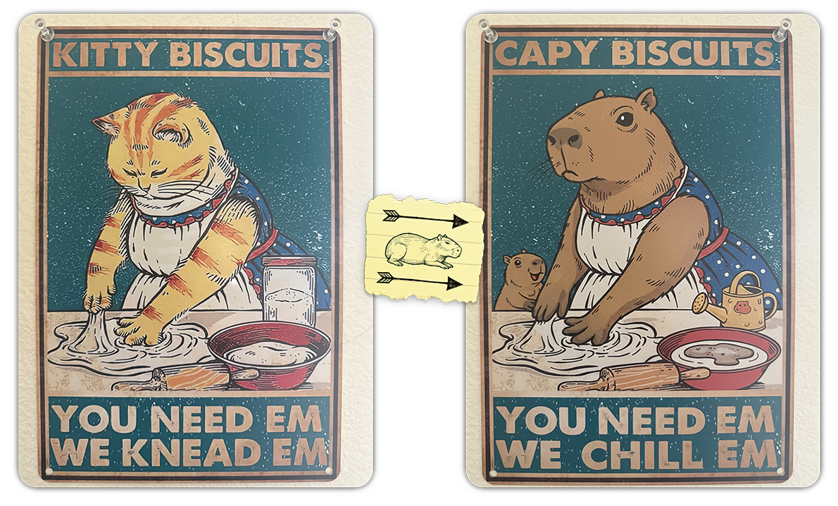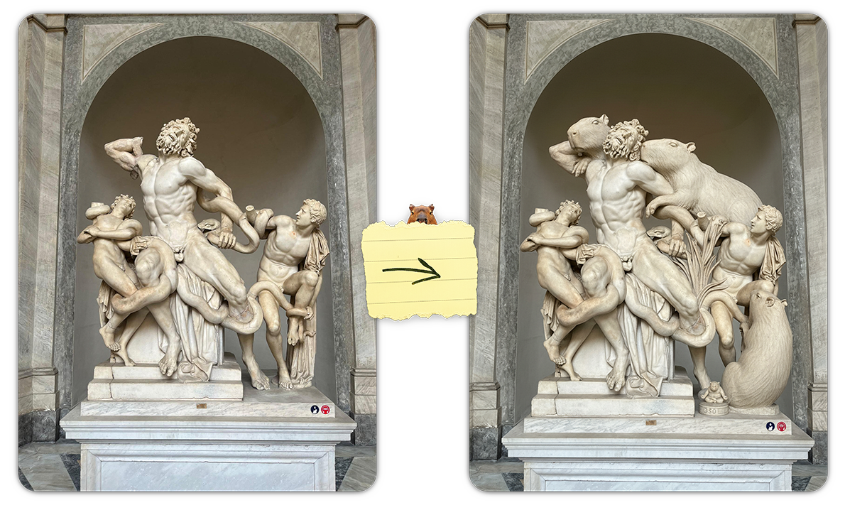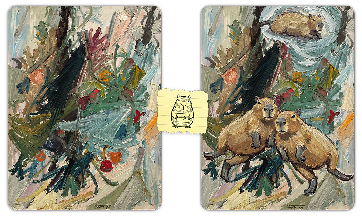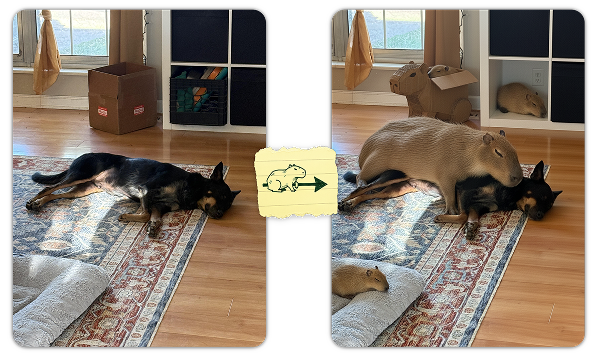 The answer is a resounding yes. It reasons about the image context and decides how to add capybaras in surprising, contextually-appropriate ways, including but not limited to replacing people and pets, reshaping objects in the environment, subtle "easter egg" background swaps, and total environmental changes. Rather than following rigid rules, the AI is making creative decisions. And the results are pretty funny, to boot!