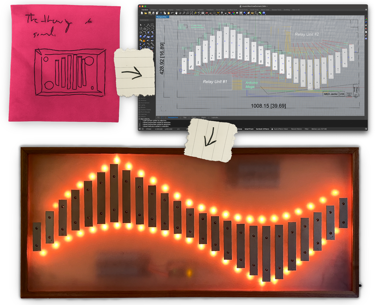 1. My original sketch, 2. One of many models I built in Rhino 3D, 3. The Music Machine at startup