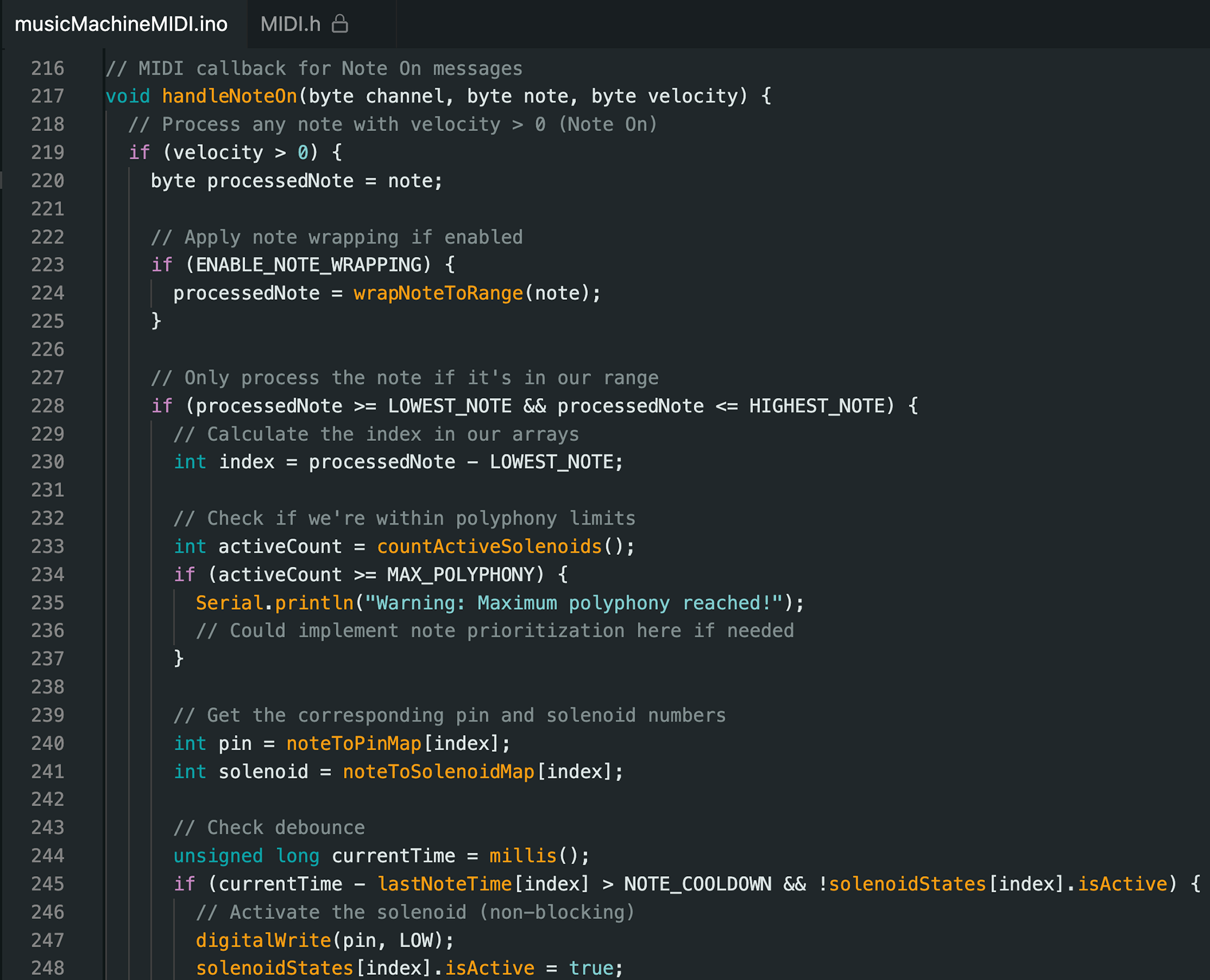 I chose MIDI input for its versatility. Because of this, the Music Machine can be used as both a playback device for prerecorded MIDI files and as an instrument when connected to a MIDI keyboard, for instance. All analog MIDI input is converted to a digital signal and processed by an Arduino Mega which converts that input signal into solenoid and LED output.