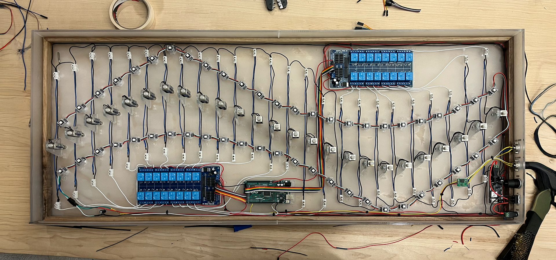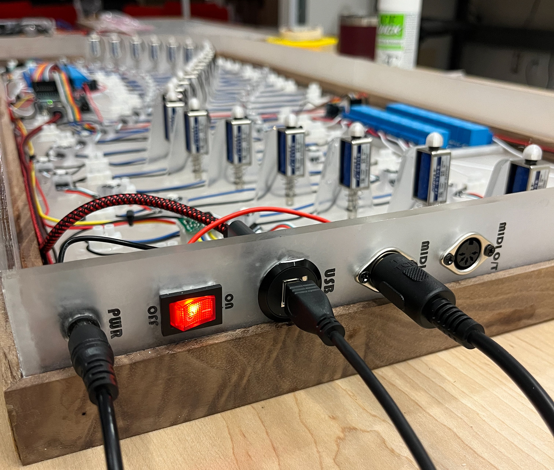 Tech: Arduino Mega, C++, Badass MIDI Chip, 25 x JF-0530B 12v solenoids, 50 x addressable LEDs, Rhinoceros 3D and Grasshopper (CAD), Bambu A1 Mini and Prusa MK4s 3D printers (modular LED mounts, prototyping), Epilog Fusion M1 Laser Cutter (acrylic panels and solenoid holders), coffee